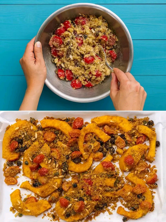 Questa ricetta nasce da una di quelle sere in cui volevo qualcosa di semplice ma con quel sapore estivo che ti fa stare bene anche in autunno. Avevo una zucca sul tavolo, dei pomodorini e un barattolo di olive taggiasche… e in pochi minuti è nata una meraviglia. Il profumo che esce dal forno è una carezza: zucca dolce, acciughe sapide, capperi, origano e quel tocco croccante di pangrattato e pinoli. È un piatto povero e ricco allo stesso tempo — buonissimo caldo, tiepido o anche il giorno dopo, freddo di frigo (anzi, forse ancora meglio).
