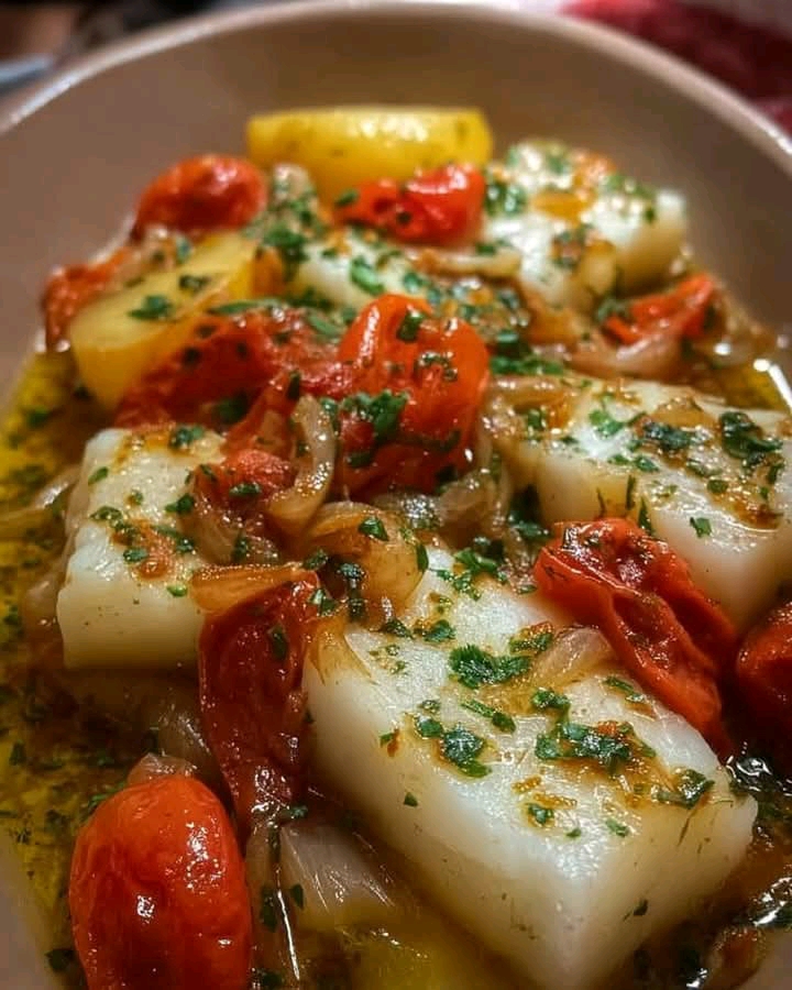 🐟🥔 Baccalà con patate, pomodorini e cipolle — il comfort food mediterraneo che profuma di casa