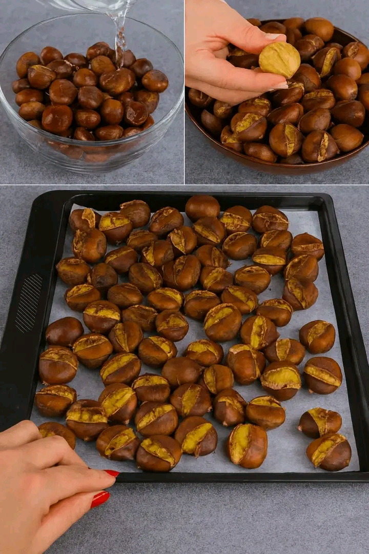 - Cottura in forno: Disponi le castagne su una teglia foderata con carta forno, taglio verso l’alto. Cuoci a 180 °C per 25-30 minuti, mescolando a metà cottura.
