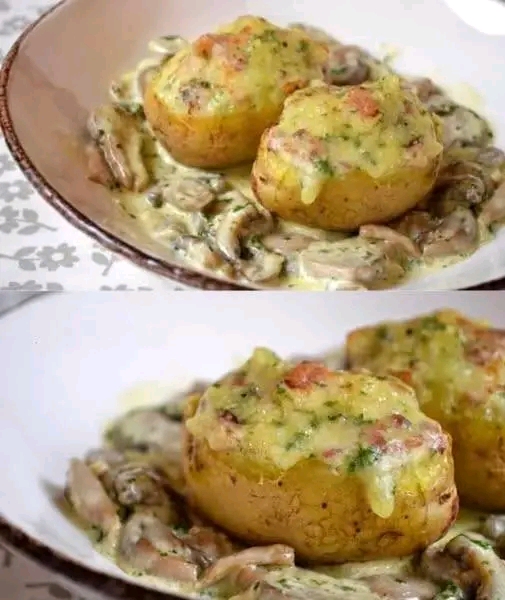 💡 Servizio: Servi le patate ripiene ben calde, accompagnate subito dalla cremosa salsa di funghi. 😋 Goditi questo piatto super comfort!