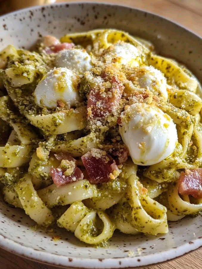💚✨ Linguine con Pesto di Pistacchi, Bufala e Pancetta – Un Primo Piatto Cremoso e Irresistibile