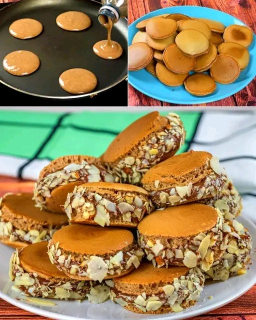 Una volta cotti tutti i pancakes, spalma un cucchiaino di crema di nocciole tra due dischi per creare dei mini sandwich. Arrotola i bordi nei pezzetti di nocciole e mandorle tritate per un effetto croccante e irresistibile.