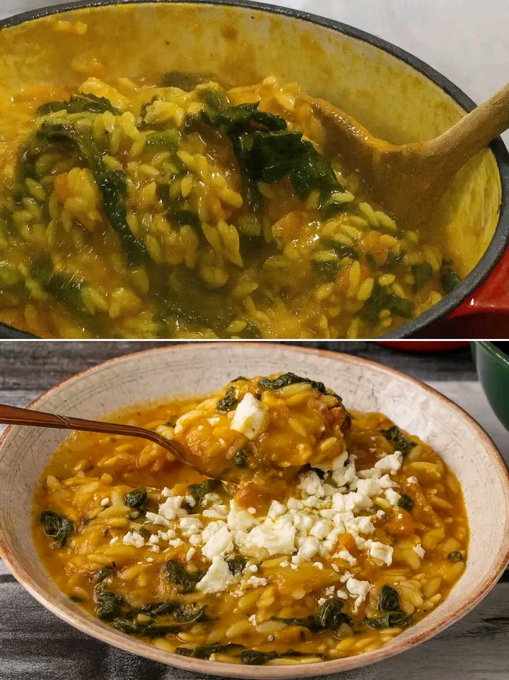 350 g di risoni (pastina a chicco di riso) 800 g di zucca delica (peso già pulito) 200 g di cavolo nero (foglie lavate e private della costa dura) 200 g di feta greca 1 cipolla piccola tritata fine 1 L di acqua calda o brodo vegetale leggero 1 rametto di rosmarino Peperoncino a piacere 3 cucchiai di olio extravergine d’oliva Sale quanto basta —👩🍳 Procedimento