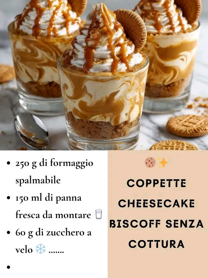 Questo dolce è un concentrato di profumo di biscotti Lotus, morbidezza della crema al formaggio e quel tocco irresistibile della crema Biscoff che scivola sopra come una salsa vellutata. Niente forno, niente gelatina, niente rischi: solo ingredienti semplici, una ciotola e 20 minuti del tuo tempo. È uno di quei dessert che fanno felici tutti — grandi, bambini, chi ama i dolci cremosi, chi va matto per i biscotti speziati e chi vuole una ricetta “sicura” al 100%.