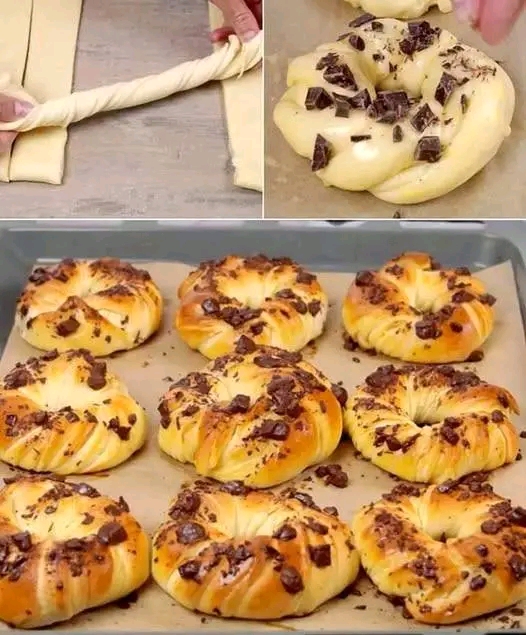 Taglia 12 strisce, arrotola ciascuna e chiudi a forma di ciambella. Aspetto rustico, soffice e irresistibile. 🍩