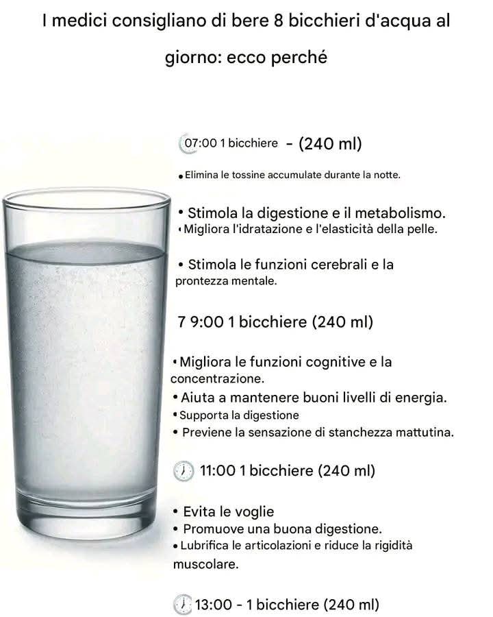 - 17:00 – Sesto bicchiere: prepara il corpo per attività fisica o fine giornata.