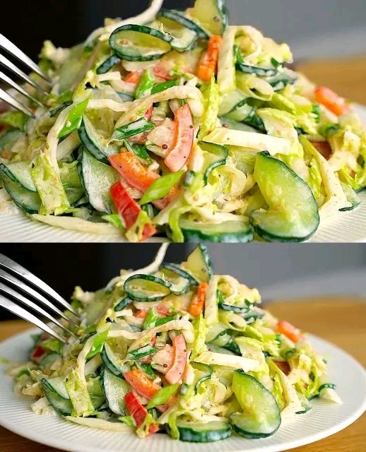 1. Preparare le verdure: In una grande ciotola, unisci cavolo cinese, cetrioli e peperoni. Aggiusta di sale e mescola bene.