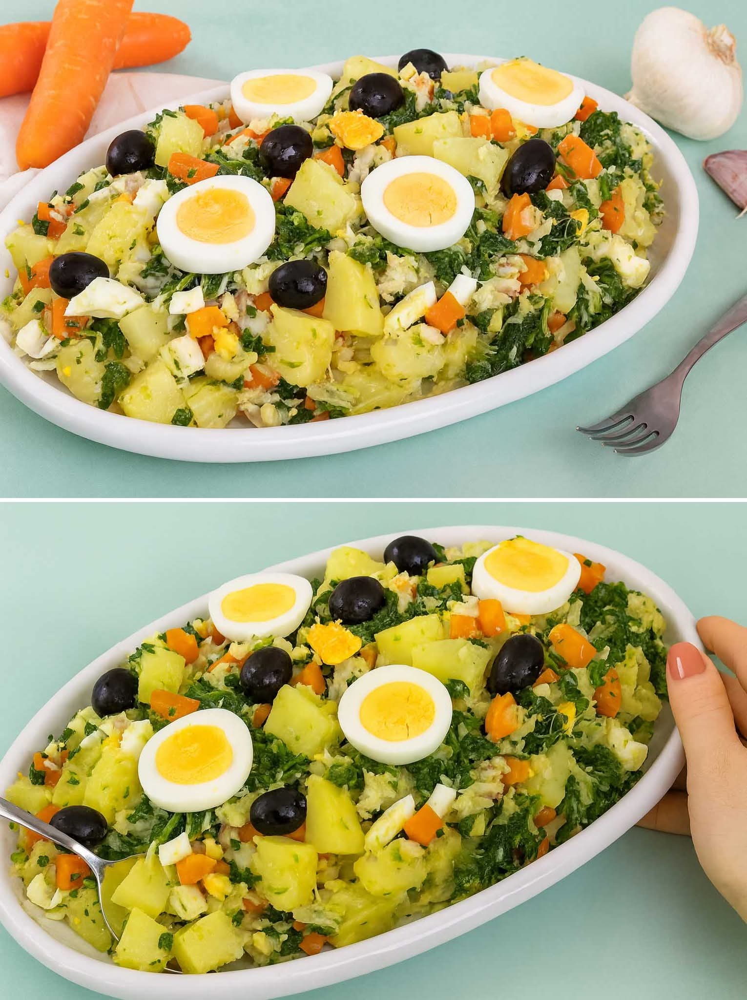 Il baccalà con patate e verdure è un piatto nutriente e bilanciato, perfetto per una cena leggera ma ricca di gusto. Con l’aggiunta di verdure fresche come il cavolo riccio, le carote e le olive, è un piatto completo che offre una buona quantità di proteine, fibre e vitamine. Il suo sapore unico, grazie alla combinazione di baccalà, olio d’oliva, aceto e uova sode, lo rende un piatto che non passerà inosservato. 🥗