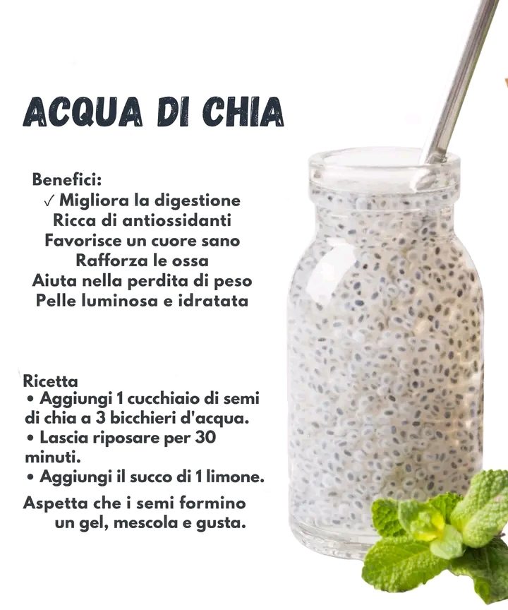 Se consumata con consapevolezza, l’acqua di chia supporta la digestione, favorisce l’idratazione, aiuta il controllo del peso e contribuisce al benessere generale. Un piccolo rituale quotidiano che può fare una grande differenza.