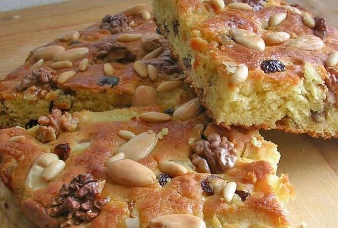 - Decorazione: Distribuire noci e mandorle sulla superficie. Sbattere l’uovo rimasto con zucchero e spennellare la piada.