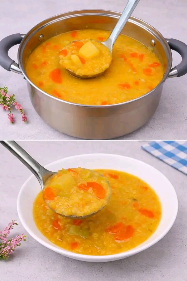 Infine versate 2 mestolate di brodo alle uova, mescolate con la frusta a mano, versate il tutto nella zuppa, amalgamate e portate in tavola.