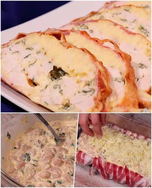 Fodera una teglia rettangolare con le fette di pancetta, facendo sporgere leggermente i bordi. Cospargi metà del formaggio grattugiato sopra la pancetta. Versa il composto di pollo e panna e distribuiscilo in modo uniforme. Copri con il formaggio restante e chiudi i bordi della pancetta, aggiungendone alcune fette anche al centro del rotolo.