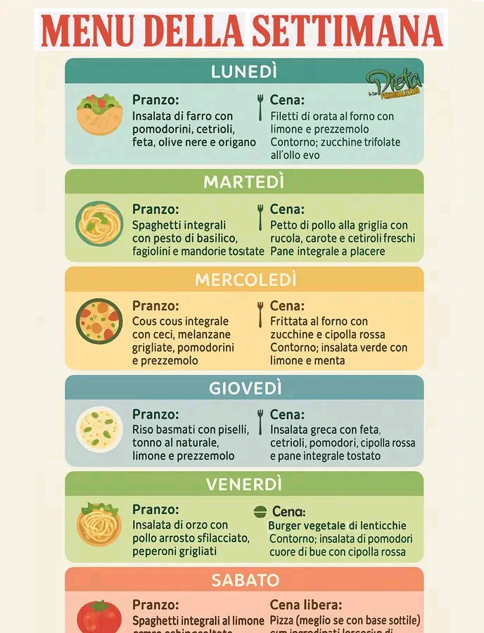 Ho preparato un menù settimanale pensato per essere semplice, bilanciato e, soprattutto, gustoso. Ogni giorno troverai un pranzo leggero ma completo, ideale per affrontare con energia le ore pomeridiane, e una cena equilibrata, per concludere la giornata con gusto e leggerezza.