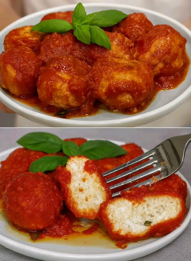Queste polpette di ricotta sono uno di quei piatti che preparo quando voglio qualcosa di morbido, confortante, che sa un po’ di casa della nonna. La ricotta fa tutto da sola: vengono soffici, leggere, quasi cremose dentro. E poi il bello è che non devi friggerle, non devi passare ore a impanare… le tuffi direttamente nel sugo e cucinano lì, piano piano, assorbendo tutto il profumo del pomodoro e del basilico. 🌿🍅