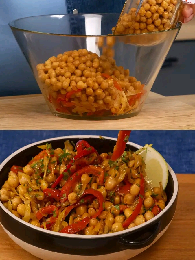 Trasferisci peperoni e cipolle (con tutto il loro sughetto!) nella ciotola con i ceci.