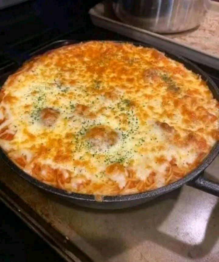 Prendi una teglia rotonda (o una padella in ghisa che possa andare in forno, proprio come nella foto!). Crea uno strato generoso di spaghetti e polpette. Ora, copri tutto con una cascata di mozzarella, cheddar e pecorino. Non aver paura di esagerare: vogliamo che la pasta sia completamente nascosta da un tappeto dorato! 🧀🌋